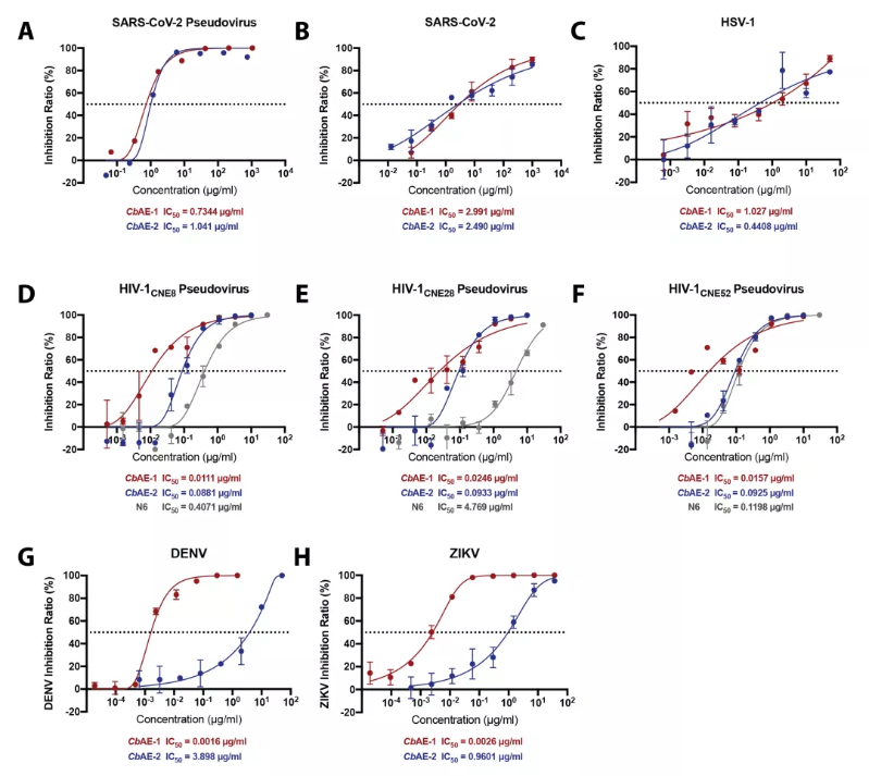 图1:抗病毒效应因子CbAE-1和CbAE-2抑制多种包膜病毒感染。(A)新冠病毒(SARS-CoV-2)假病毒;(B)新冠病毒(SARS-CoV-2);(C)单纯疱疹病毒(HSV);(D-F)人类免疫缺陷病毒(HIV)假病毒;(G)登革病毒(DENV);(H)寨卡病毒(ZIKV)