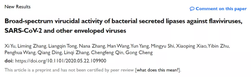2020年5月23日,清华大学医学院程功课题组在预印本平台 BioRxiv 在线刊登了题为:Broad-spectrum virucidal activity of bacterial secreted lipases against flaviviruses, SARS-CoV-2 and other enveloped viruses(细菌分泌型脂酶对黄病毒、新冠病毒和其他包膜病毒的广谱抗病毒活性)的最新研究成果。