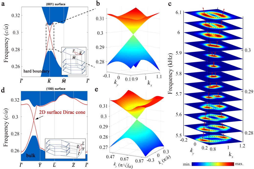 图3.三维声拓扑绝缘体中的二维无能隙表面态。(a-b)计算得到的在xy面(001)表面狄拉克锥。(c)实验测量结果。(d-e)yz面(100)计算得到的表面狄拉克锥。