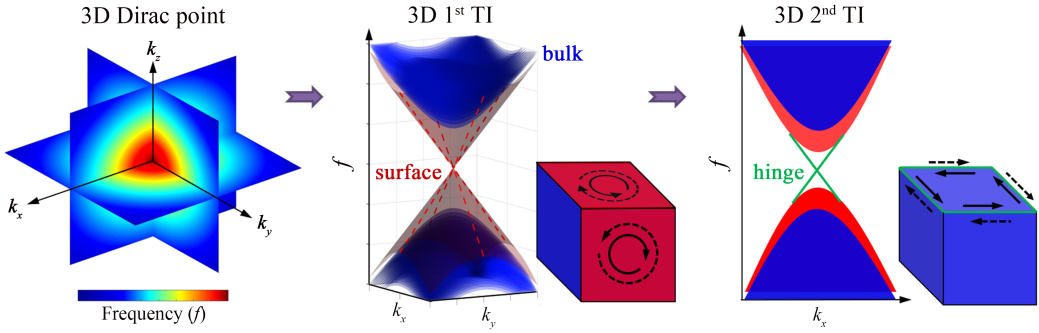信息处理和存储技术的发展对集成器件的性能提出了更高的要求。在传统的集成器件中,由于加工过程中不可避免的缺陷和杂质,使得波在传输过程中存在着背向散射损耗,因而降低了器件的传输距离和效率。拓扑材料以其独特的缺陷免疫和背散射抑制特性为克服这一困难提供了方案。拓扑物理的研究始于电子系统,而近十余年来,研究人员将其推广到了光、声、机械等经典波领域,并且成功实现了多种类型的光/声拓扑态。比如背散射抑制和抗辐射损耗的光/声波导,任意形状的高效率、低阈值的拓扑激光等等。最近,三维声/光拓扑绝缘体备受关注。相比于二维系统,三维系统多出了一个空间自由度,具有更多的结构类型和对称操作可供选择与调控。此外,根据拓扑材料"体-边对应关系",在三维拓扑绝缘体中,不仅可以得到拓扑保护的二维表面态(一阶声拓扑绝缘体),用于实现一些如折射、成像等一维波导无法实现的拓扑现象和功能;也可以得到更低维度的一维棱态(二阶)和零维角态(三阶)。这为多维度调控声波传播提供了新的可能(如图1所示)。