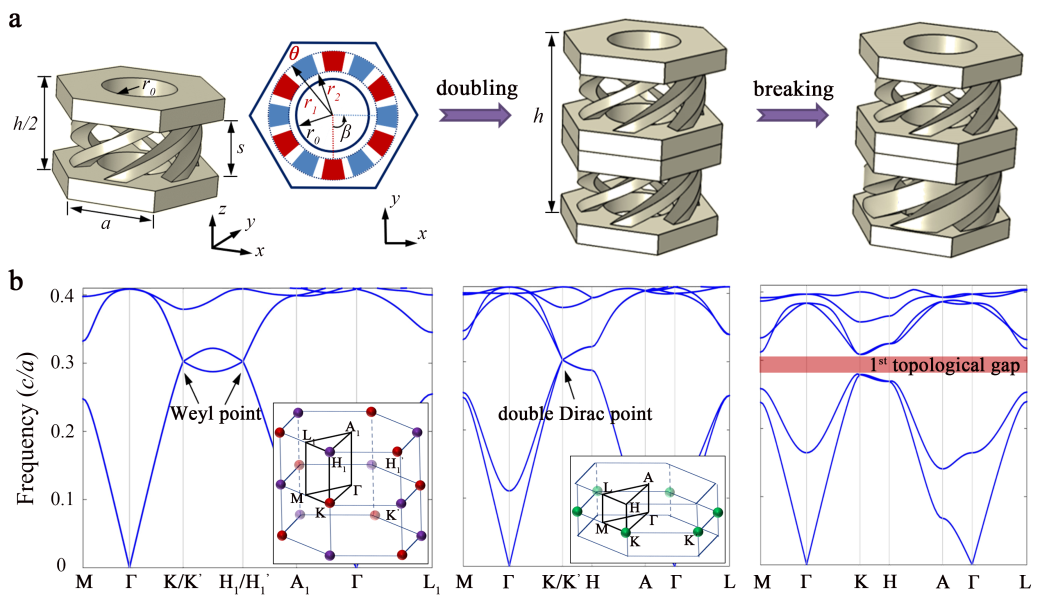图2. 沿z的能带折叠和打开。(a)从左到右:单层三维手性螺旋结构,双层,破缺螺旋对称的双层结构。(b)对应的能带结构。其中,两个相反外尔点折叠成四重狄拉克点,狄拉克点破缺形成三维拓扑全带隙。