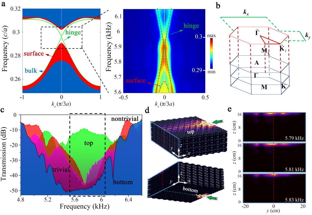 图5. 三维二阶声拓扑绝缘体。(a)左:x方向无能隙棱态计算结果;右:测量结果。(b)布里渊区沿z的第一次投影和在x/y向的第二次投影。(c)声透射谱测量结果。其中,紫红/红对应非平庸/平庸的xy方向表面态,绿/蓝对应上/下表面的x向棱态。(d)声压分布模拟。(e)出射面的声压分布测量结果。