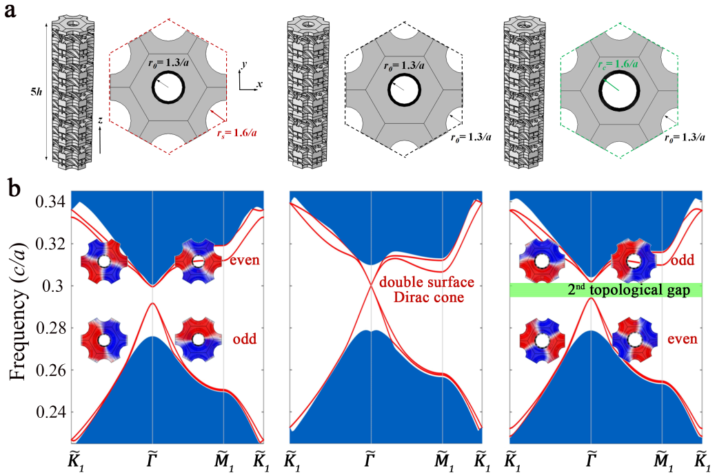 图4.xy平面能带折叠与反转:(a)中:三倍初基元胞;左:增大边上孔径;右:增大中间孔径。(b)声表面态能带反转:从左到右展示了平庸到非平庸的拓扑转变,转变点为简并的声表面态狄拉克点。