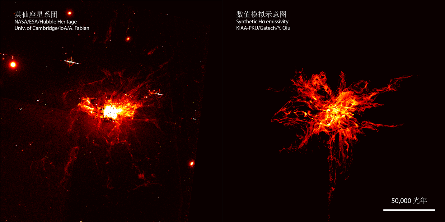 此前的理论研究认为,冷气体由离子气体的热不稳定性造成,并在引力作用下落入星系团中心,留下纤维状的踪迹。然而,邱宇主导的数值模拟研究首次揭示了活动星系核反馈所驱动的、由内而外的气体外流是该纤维状结构形成的关键。初始温度在一万到一千万开尔文的气体外流的冷却时间小于它们上升到最大高度的时间,因此在外流路径中自然形成纤维状冷气体。通过这种方式形成的结构与天文观测的结构高度吻合(如上图所示)。