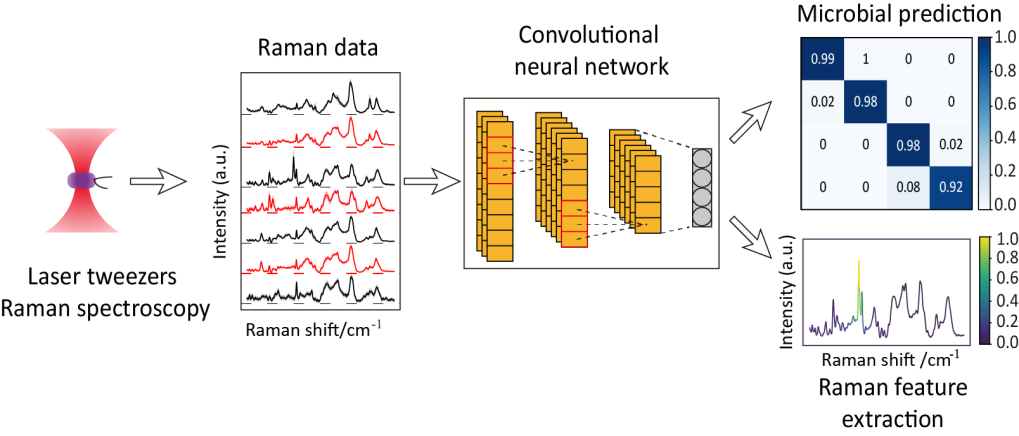 拉曼光镊结合人工智能快速鉴定微生物单细胞和特征光谱提取的流程及示意图