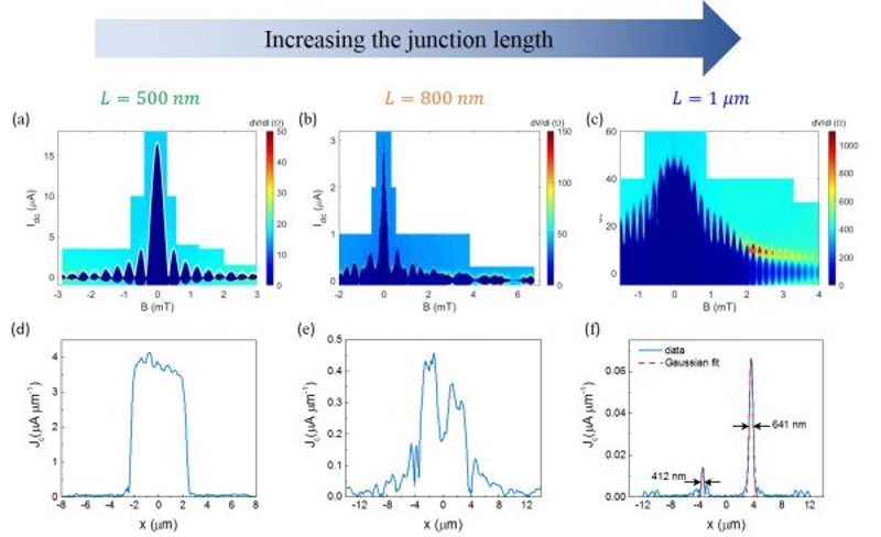 图3:随着沟道长度的增长,磁场下超导临界电流干涉图样由Fraunhofer衍射图样逐渐转变为SQUID图样
