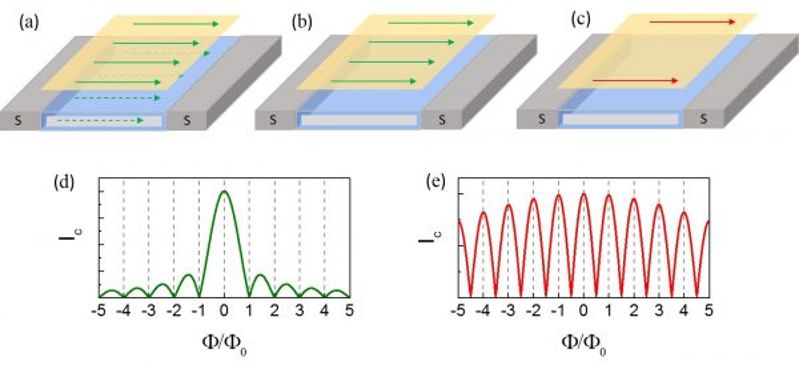 对于一维棱态,则可以通过超导临界电流在垂直磁场下的干涉图样来验证。如果超导电流在结中是均匀分布的,超导临界电流随磁场变化对应的是夫琅禾费(Fraunhofer)衍射图样。而如果超导电流分布在结的一维边界上,则会表现出超导量子干涉器件(SQUID)图样。因此通过超导临界电流随磁场的响应则可以验证一维边界态的存在与否。