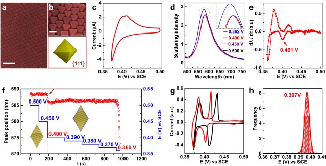 针对上述挑战,任斌教授课题组发展了一套高灵敏的电化学暗场散射光谱装置,在不使用特殊光源的情况下,可以使得检测的粒径小至10-15 nm,灵敏度提高到亚单层原子。他们利用该装置从单颗粒水平原位表征了具备{111}基础晶面的纳米八面体和具有{100}基础晶面的纳米立方体表面的欠电位沉积过程。首次观测到了单个粒子表面亚单层至单层原子的电沉积过程,并获得了单个粒子表面欠电位沉积的准确电位及其分布。进而利用散射光谱直接构建了单个纳米粒子的电化学循环伏安曲线(CV), 该CV曲线不受双电层充电以及氧还原等过程的影响,突破了传统电化学方法难以单个纳米颗粒CV特性的局限,为深入理解纳米粒子表面的欠电位沉积机理以及实现单层原子沉积的精确调控提供了重要的实验支撑。该方法还可以用于构建具有复杂晶面的纳米粒子的CV曲线,表征单个粒子表面不同晶面上的单层原子电沉积过程,为实现在原子尺度上选择性修饰纳米材料表面的不同晶面提供了指导。而且通过所获得的CV曲线能够精准地定量出单个粒子表面不同晶面的面积比。该方法若和具有高时空分辨的光谱仪器联用,将能更为高效、快速筛选纳米催化剂及表征其表面结构。