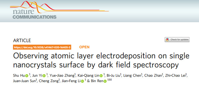 化学化工学院任斌教授课题组在电化学单颗粒暗场光谱表征新装置的研究中取得重要进展,相关研究以“Observing atomic layer electrodeposition on single nanocrystals surface by dark field spectroscopy”为题发表于Nature Communications (Nat. Commun., 2020, doi: 10.1038/s41467-020-16405-3)。