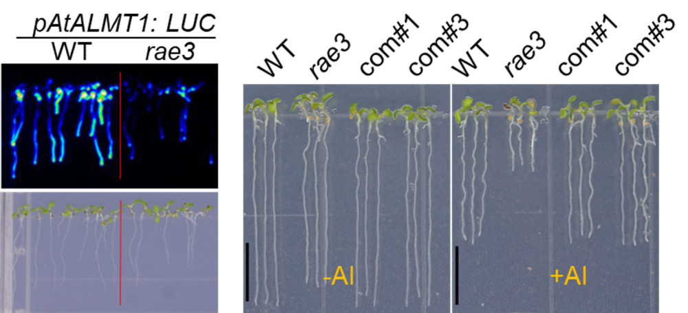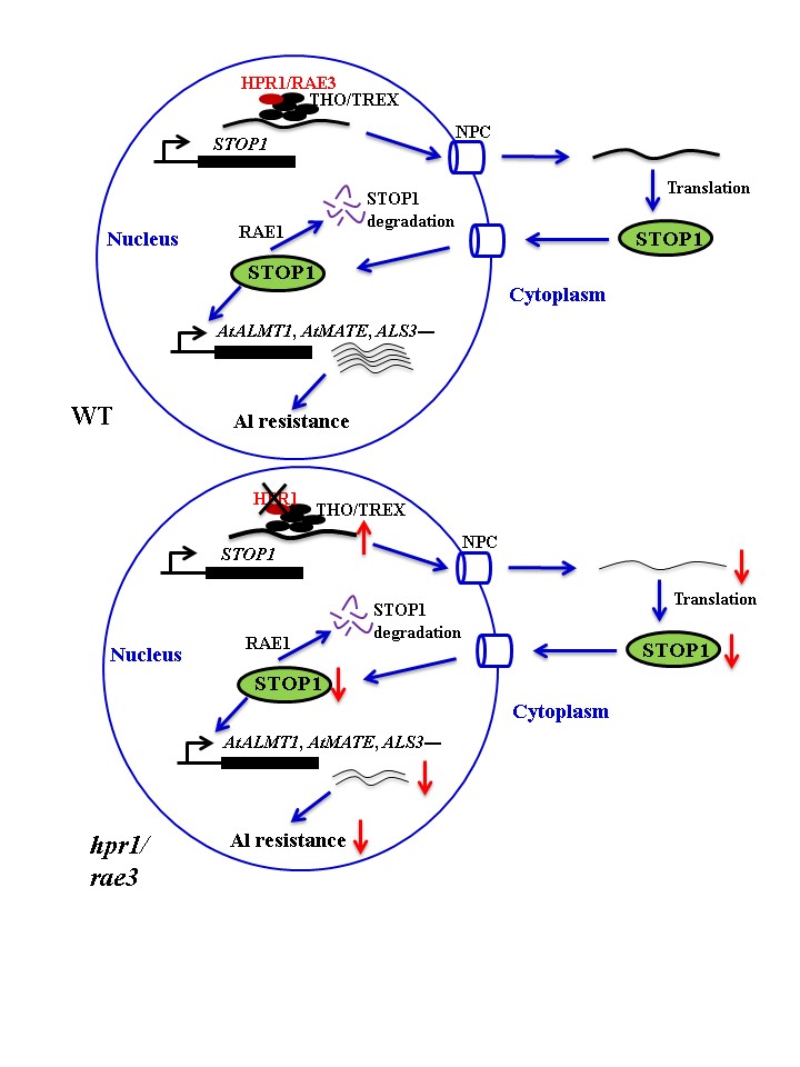 铝毒是酸性土壤作物生产的主要限制因子,也是仅次于干旱的第二大非生物逆境。为了适应酸性土壤的铝毒害,许多植物进化了抗铝毒机制。铝毒诱导的有机酸(苹果酸、柠檬酸、草酸)分泌机制是植物中广泛存在的抗铝毒机制。模式植物拟南芥主要通过阴离子转运蛋白AtALMT1介导苹果酸的分泌来解除铝毒害。STOP1是关键的抗铝毒转录因子,它主要通过直接调控AtALMT1的表达来介导对铝毒的抗性。该课题组之前的研究表明,铝毒主要在转录后水平调控STOP1蛋白的积累(Zhang et al. 2019. PNAS)。为了研究STOP1的转录后调控机制,构建了AtALMT1启动子与荧光素酶基因(LUC)融合的报告基因系,通过筛选LUC荧光发生改变的突变体来鉴定和克隆调控STOP1的基因。利用此报告基因系统,该研究组之前筛选获得了一系列LUC荧光发生改变的突变体,并报道了一个在翻译后水平调控STOP1蛋白稳定性的F-box蛋白RAE1(Zhang et al. 2019. PNAS)。本研究利用之前获得的突变体克隆了一个在转录后水平调控STOP1的RAE3 (Regulation of AtALMT1 Expression 3)基因。RAE3基因突变使包括AtALMT1在内的STOP1下游基因表达下降,这导致rae3突变体对铝毒更敏感而对低磷诱导的根生长抑制更不敏感。RAE3编码mRNA输出复合物THO/TREX中的HPR1。该研究证明了RAE3主要通过调控STOP1 mRNA的核质运输从而调控STOP1蛋白的积累,进而影响植物的抗铝毒和低磷响应。