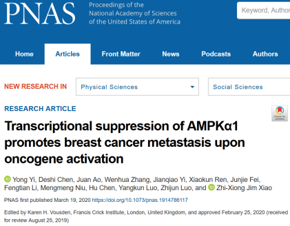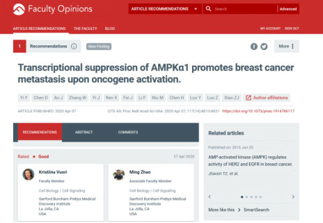 近日,我校生命科学学院肖智雄教授团队在PNAS在线发表了题为“Transcriptional Suppression of AMPKa1 Promotes Breast Cancer Metastasis upon Oncogene Activation”的研究论文,首次揭示了转录抑制AMPK在PI3K/HER2驱动的乳腺癌转移中起着关键调控作用。该论文于2020年4月27日得到美国桑福德伯纳姆普利贝斯医学研究所所长、美国国家癌症研究所顾问Kristiina Vuori博士的强力推荐,列为世界学术组织“Faculty Opinions (原F1000Prime)”推荐论文,并进行点评。