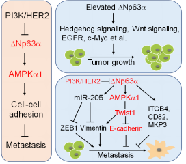 远端转移是导致乳腺癌患者死亡的主要原因。研究乳腺癌远端转移的分子机制及药物靶点一直是乳腺癌研究领域的前沿和热点。AMPK(腺苷酸激活蛋白激酶)在细胞能量感知和维持细胞能量稳态过程中起着关键作用。目前关于AMPK的研究主要集中在其激酶活性调控及蛋白稳定性上。而对AMPK基因的转录调控则知之甚少。肖智雄团队前期研究发现PI3K/HER2/Ras信号通路通过转录抑制p53家族成员DNp63a,从而促进肿瘤转移 。他们继而在临床乳腺癌样本中分析发现,AMPK的催化亚基AMPKa1的mRNA表达在PIK3CA激活突变或HER2阳性的乳腺癌组织中显著降低,且DNp63a表达与AMPKa1表达呈正相关。进一步研究发现,DNp63a是AMPKa1的直接转录因子;PI3K/HER2通过抑制DNp63a,进而抑制AMPKa1基因转录,最终导致乳腺癌细胞侵袭和肿瘤转移。关于AMPK调控乳腺癌转移的分子机制,他们发现基因沉默AMPKa1显著增加Twist1的蛋白表达,导致E-cadherin的表达下调和细胞之间的粘附减弱,从而促进了乳腺癌细胞的侵袭和肿瘤转移。