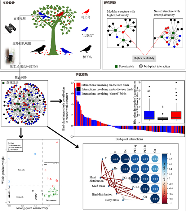通过直接观测(累计调查479棵树,观测时长为4360 h.)和红外相机(累计调查405棵树,观测时长为29160 h.)对13个森林斑块、19种植物、47种食果鸟类进行了研究,重点构建和分析了树上和树下食果鸟类与植物之间的种子传播集合网络。他们的研究发现:种子传播的空间集合网络为中度模块结构;与树下鸟相比,树上鸟和共享鸟与植物之间的种间互作在集合网络具有更高的中心性,对集合网络结构的贡献也更大;同时树上鸟和共享鸟在集合网络中主要扮演着“枢纽”和“连接者”的角色,促进了不同斑块之间的联系。因此,树上鸟和共享鸟对区域过程有较大贡献,而树下鸟则可能主要参与局域过程。他们还发现,传播大种子以及分布范围较广的物种所产生的种间互作有助于集合网络的区域功能维持。