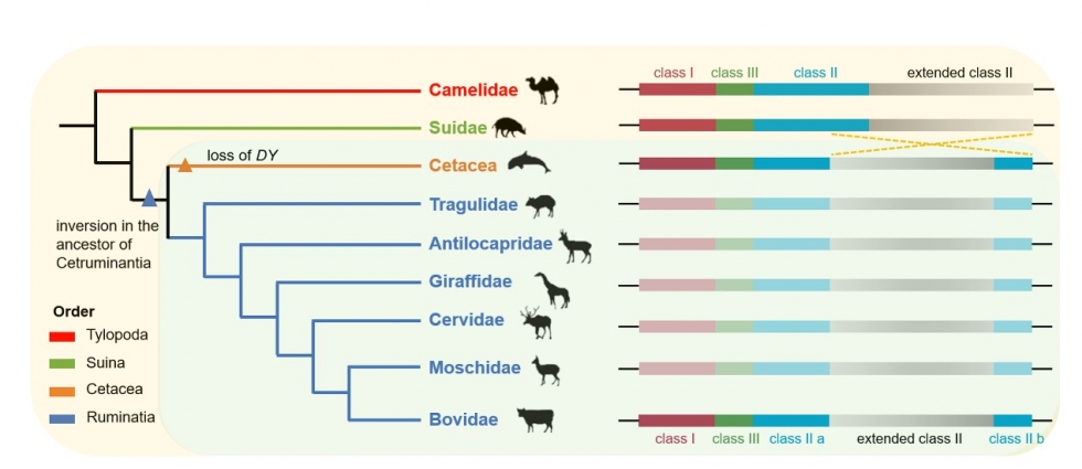 MHC编码一大类免疫防御相关蛋白与调控因子,是人类和所有哺乳动物免疫抵抗各类微生物侵染和致病性最为关键的遗传基础。反刍动物利用瘤胃微生物有效转化固定于饲草中的太阳能,对于维持地球高等肉食动物的食物链起到了承上启下的关键作用。马润林研究组在前期研究中证实家牛和绵羊MHC区域内有一段约18 Mb染色体倒位,造成MHC class II区域被分割为II a和II b两个亚区。反刍动物特有的DY基因位于倒位边缘并且在树突状细胞中高度表达。但该倒位在反刍动物中是否具有普遍性以及对反刍动物进化的意义尚属未知。