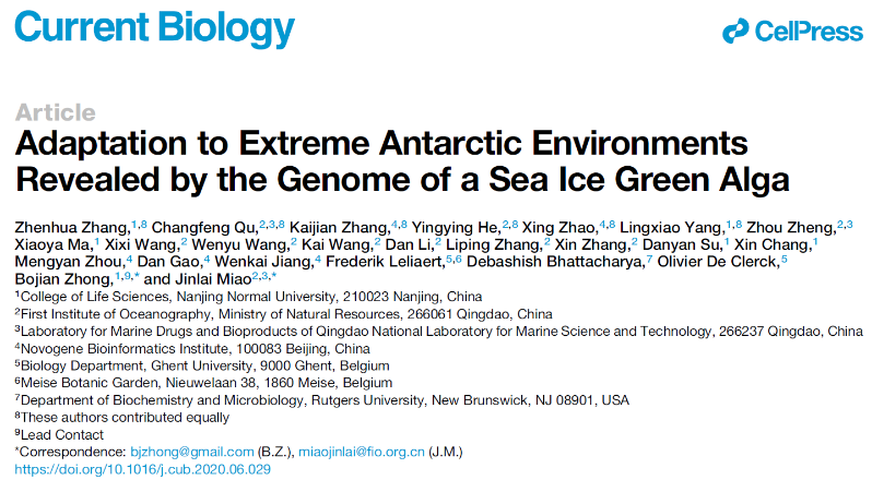 近日,南京师范大学生命科学学院钟伯坚教授团队联合自然资源部第一海洋研究所缪锦来研究员团队在Current Biology发表了题为“Adaptation to Extreme Antarctic Environments Revealed by the Genome of a Sea Ice Green Alga” 的研究论文,对南极海冰生态系统特有的南极衣藻进行了基因组适应性进化研究,揭示了南极嗜冷绿藻基因组水平适应极端环境的分子机制。