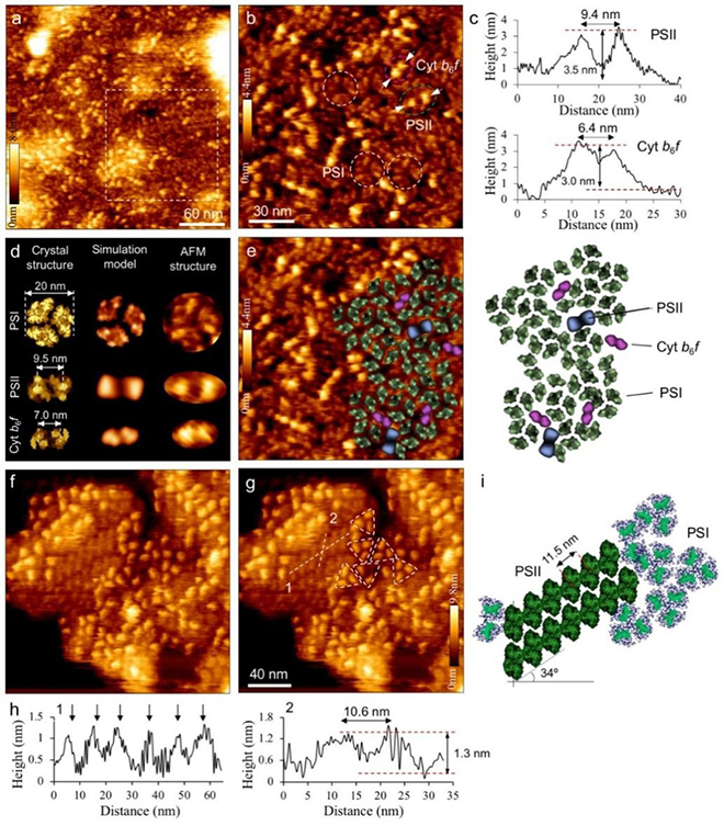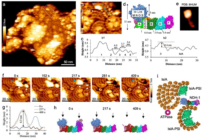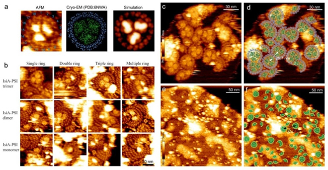 图2. 高光适应蓝藻Syn7942类囊体膜的原子力显微镜图像,展示了IsiA-PSI超复合物的天然超分子结构。