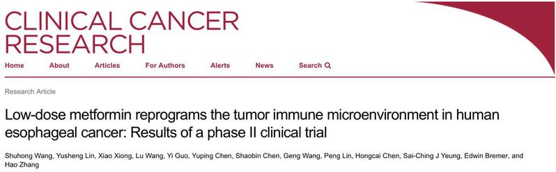 2020年7月9日,我院张灏团队在美国癌症学会杂志Clinical Cancer Research上报告了世界上第一个应用二甲双胍治疗食管鳞癌的临床试验。该研究表明糖尿病药物二甲双胍在杀伤病人肿瘤细胞之前,已经对肿瘤免疫微环境进行了重编程改造。在临床试验的基础上,课题组通过食管癌小鼠模型进行了更详细的验证和延伸,并结合细胞实验对二甲双胍编程免疫微环境的机制进行了探讨。