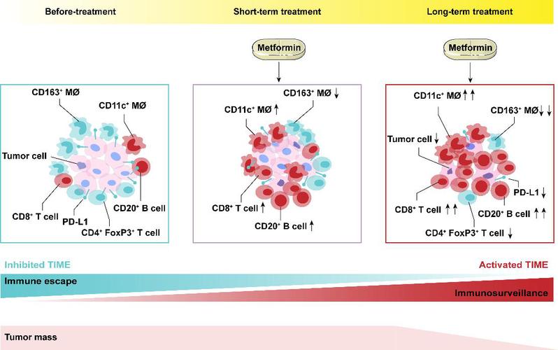 食管鳞癌是我国高发的恶性肿瘤,全世界的食管癌患者一半在中国。食管鳞癌目前主要的治疗手段仍是以手术为主、辅之放疗和化疗, 2017年发表在Lancet Oncology的研究指出, PD-1单抗Nivolumab 用于食管鳞癌治疗的客观反应率(Object Response)为14%。研究团队在前期二甲双胍治疗食管鳞癌临床前研究的基础上,组织申报了临床试验,并开始募集食管鳞癌患者,在手术前对病人开展低剂量二甲双胍治疗。研究人员分析术后获取的肿瘤标本发现和安慰剂组相比,低剂量二甲双胍用药组的肿瘤组织并没有明显的形态学改变,以及细胞增殖和凋亡等变化。研究人员进一步对肿瘤微环境中各种免疫细胞进行了系统的检查,通过应用多标记免疫荧光染色及多光谱成像技术,发现B细胞、T细胞和巨噬细胞发生了有趣的改变。研究人员对组织中免疫细胞浸润情况进行了综合评估,将食管鳞癌肿瘤免疫微环境分为三种不同状态,分别为激活状态肿瘤免疫微环境(Activated-TIME),平衡状态肿瘤免疫微环境(Equilibrium -TIME)以及抑制状态肿瘤免疫微环境(Suppressive-TIME)。经统计分析发现低剂量二甲双胍通过修饰食管鳞癌中肿瘤免疫微环境,使肿瘤免疫微环境激活,向抗肿瘤免疫的方向改变。