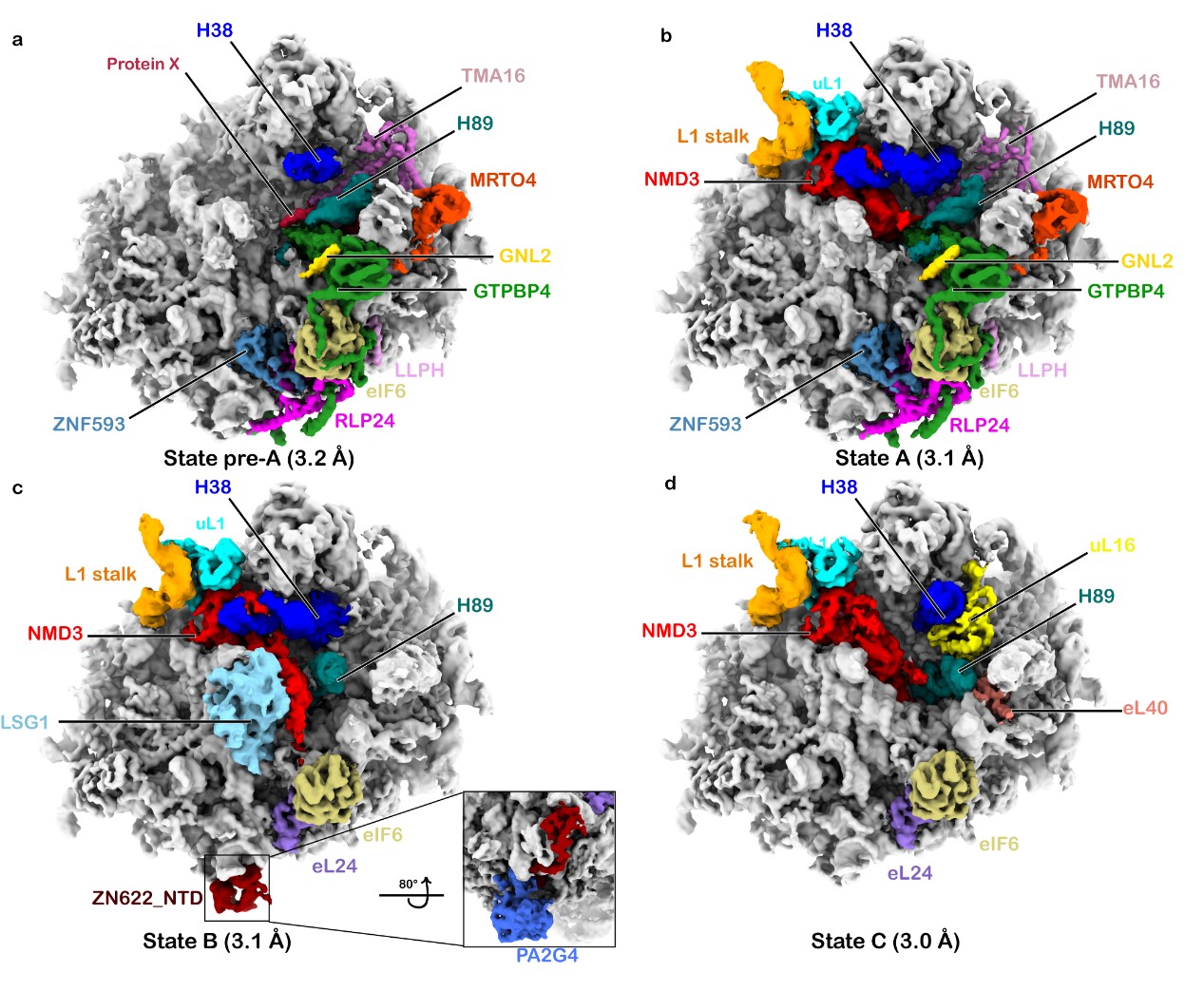 本研究以人源大亚基的出核转运接头蛋白NMD3为诱饵,通过在其C端加入亲和标签纯化出了一系列出核前后的大亚基组装前体内源复合物,并通过冷冻电镜解析了四个不同前体复合物的高分辨率结构。研究在这四个结构中发现了十余个人源组装因子,包括NMD3、GTPBP4、LSG1、EIF6、MRTO4、ZNF622、ZNF593、LLPH、RLP24、GNL2、TMA16、PA2G4及一个未知蛋白protein X,为进一步研究这些因子准确的分子功能和机制提供了结构基础。例如,TMA16是一个保守的蛋白,但并未在之前发表的酵母大亚基前体复合物中发现,表明核糖体组装过程中蛋白因子的结合时可能受到精密的调控。再如,PA2G4(Ebp1)具有不同的剪切形式,是一个多功能的蛋白因子。以往研究表明PA2G4在几种肿瘤的发生发展中参与了ERBB3调控的信号通路。本项研究和德国Spahn组尚未正式发表的PA2G4结合翻译过程中的80S核糖体的研究工作(Kraushar et al., 2020)则表明此因子至少在核糖体的组装和蛋白质的翻译中都具有明确的分子功能,暗示之前的工作有可能并不是直接效应。