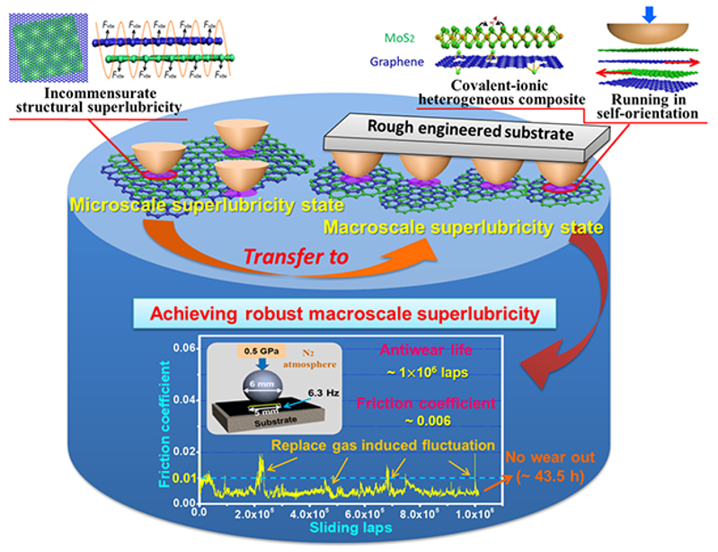 “超润滑”是近代摩擦学研究的一个重要科学发现,源于1990年左右提出的“结构超润滑”理论预测:当两个理想、平坦的刚性晶面以非公度接触方式发生相对运动时,上下表面间的原子势作用相互抵消,滑移势垒为零,出现摩擦力消失或接近为零的现象。“结构超润滑”理论的工程实现将有望为节能降耗、机械装备设计带来革命性的进步。通过近30年的研究,目前可以在一些理想的层状晶体材料(如高定向石墨)表面实现纳米以及微米接触尺度的“结构超润滑”,但在宏观工程接触尺度,材料表面不可避免存在无序、吸附和缺陷等,如何实现宏观接触尺度的超润滑已成为目前研究的焦点和工程化应用的关键瓶颈。