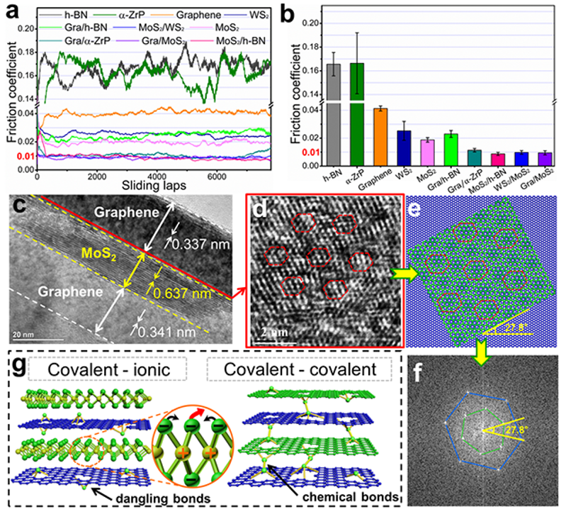 研究发现:当共价/离子型异质二维叠层复合时,展现出显著的协同润滑效应。共价型化合物(如石墨烯)以共用电子对的方式成键,具有定向性和饱和性,在滑动过程中相邻层面缺陷位置的悬键会发生强烈的化学作用。而离子型化合物(如二硫化钼)靠正负离子间的吸引作用,不具有定向性和饱和性,即使发生局部缺陷离子的丢失,周围的离子也会进行补充屏蔽,弱化其与外部的相互作用。共价/离子叠层复合设计可以有效阻隔共价化合物相邻层间的强化学相互作用,极大地削弱宏观摩擦过程中缺陷、棱边键等的不利作用。同时,异质晶格匹配在宏观摩擦过程中同样展现出天然非公度性,可以不依赖于滑移角度实现超润滑状态。该理论认识可以很好解释传统石墨与二硫化钼复合材料的协同润滑作用机制。