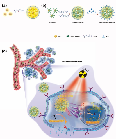 近年来,利用X射线诱导进行光动力治疗(X-PDT)逐渐成为研究热点之一。研究人员通过将光敏剂负载到光学纳米粒子上得到适用于X-PDT的纳米敏化剂,它可以将X射线转化为光学发光去激发光敏剂产生活性氧(ROS),进而在低剂量X射线的照射下实现RT和PDT的协同治疗。该团队前期研究发现,X-PDT可以将放射治疗(RT)和PDT的优点相结合,能够有效抑制深部肿瘤生长(Adv. Mater. 2019, 31, 1808024; Mater. Horiz. 2017, 4, 1092; Nano Lett. 2015,15, 2249; Theranostics 2016, 6, 2295)。