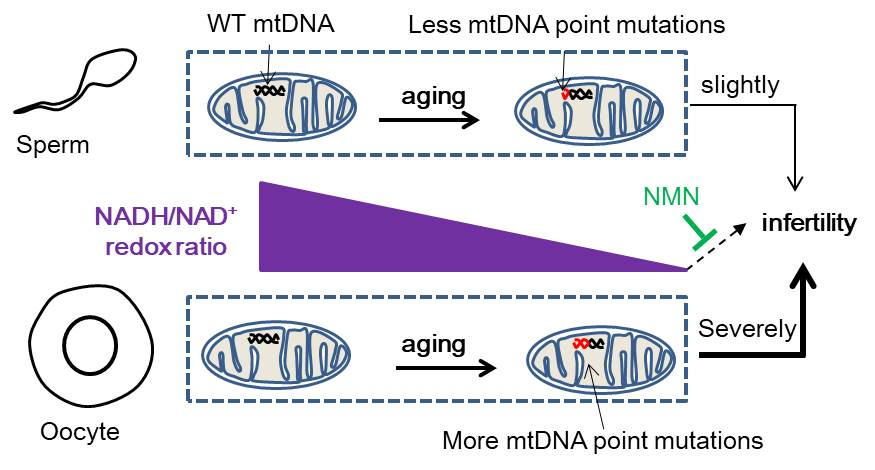 老龄生育不但是生殖与再生医学领域的基本科学问题,而且是当今我国国情的重大国家需求。衰老是影响男性和女性生育能力的关键因素之一,其中女性生育力通常在30岁后下降。另一方面,快速的环境变化也可能导致近年来不育率急剧上升。线粒体作为细胞内含有DNA的能量工厂,其功能障碍被假设在年龄和环境导致的不育中起重要作用。然而,衰老积累的线粒体DNA突变是否以及如何调节生育力及其性别依赖性仍然未知。
