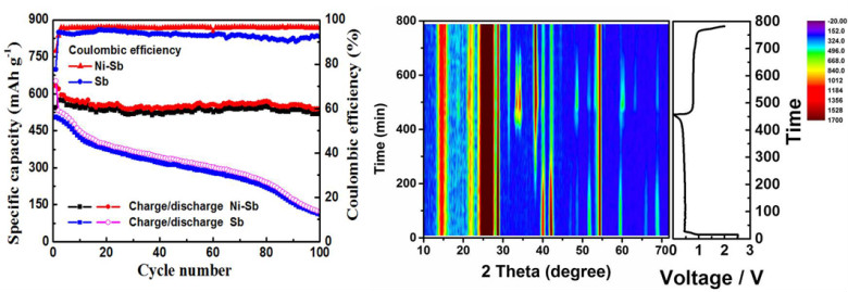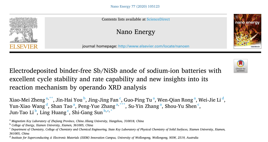 近日,国际能源顶级期刊Nano Energy (IF:16.602)在线发表了我校郑小美副教授作为第一作者,厦门大学孙世刚院士,郑小美副教授,张朋越教授为共同通讯作者,题为“Electrodeposited binder-free Sb/NiSb Anode of Sodium-ion Batteries with excellent cycle stability and rate capability and New Insights into its Reaction Mechanism by Operando XRD Analysis”(电沉积制备无粘结剂型钠离子电池Sb/NiSb负极具有良好的循环稳定性和倍率性能,并采用原位XRD揭示对其反应机理)的研究论文。