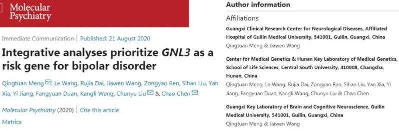 近日,附属医院广西神经系统疾病临床医学研究中心团队在国际知名学术期刊Molecular Psychiatry(IF=12.38,JCR Q1)发表题为“Integrative analyses prioritize GNL3 as a risk gene for bipolar disorder”的文章。