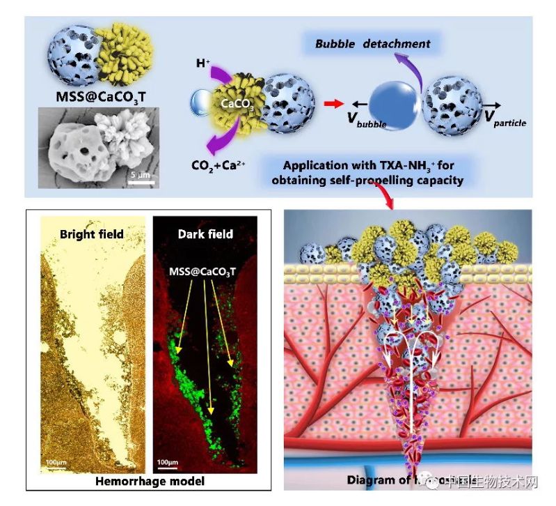 在战场创伤和意外事故中,贯穿型及窄而深的伤口,由于出血量大且出血点隐蔽,若不能及时有效的止血,短时间内即可能导致出血过多而死亡。传统的止血材料往往只能施加于伤口表面,难以及时深入伤口内部出血点,因而难以快速有效控制该类型大出血。该研究通过对止血粉的表面赋能,使止血颗粒在施加于伤口时能高精度“自推进”至深型、贯穿型、无规型等类型的大出血伤口的隐蔽出血点,并发挥其负载的止血因子的作用实现伤口靶向止血。研究成果革新传统止血材料仅仅依靠创口表面封堵的常规方式,取而代之以能实现将止血材料快速递送到伤口内部出血点进行精准止血的止血新途径。它在战场急救和事故现场急救上具有重大的应用前景,为止血材料领域中设计定向功能化结构、构建载送药物驱动力模型及研发快速有效止血材料提供新思路。