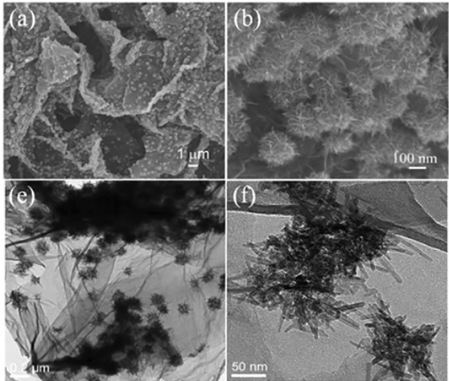 图2. 复合材料实例--石墨烯-二氧化锰三维多孔复合材料。2a,b为扫描电镜图,2e,f为复合材料的透射电镜图。