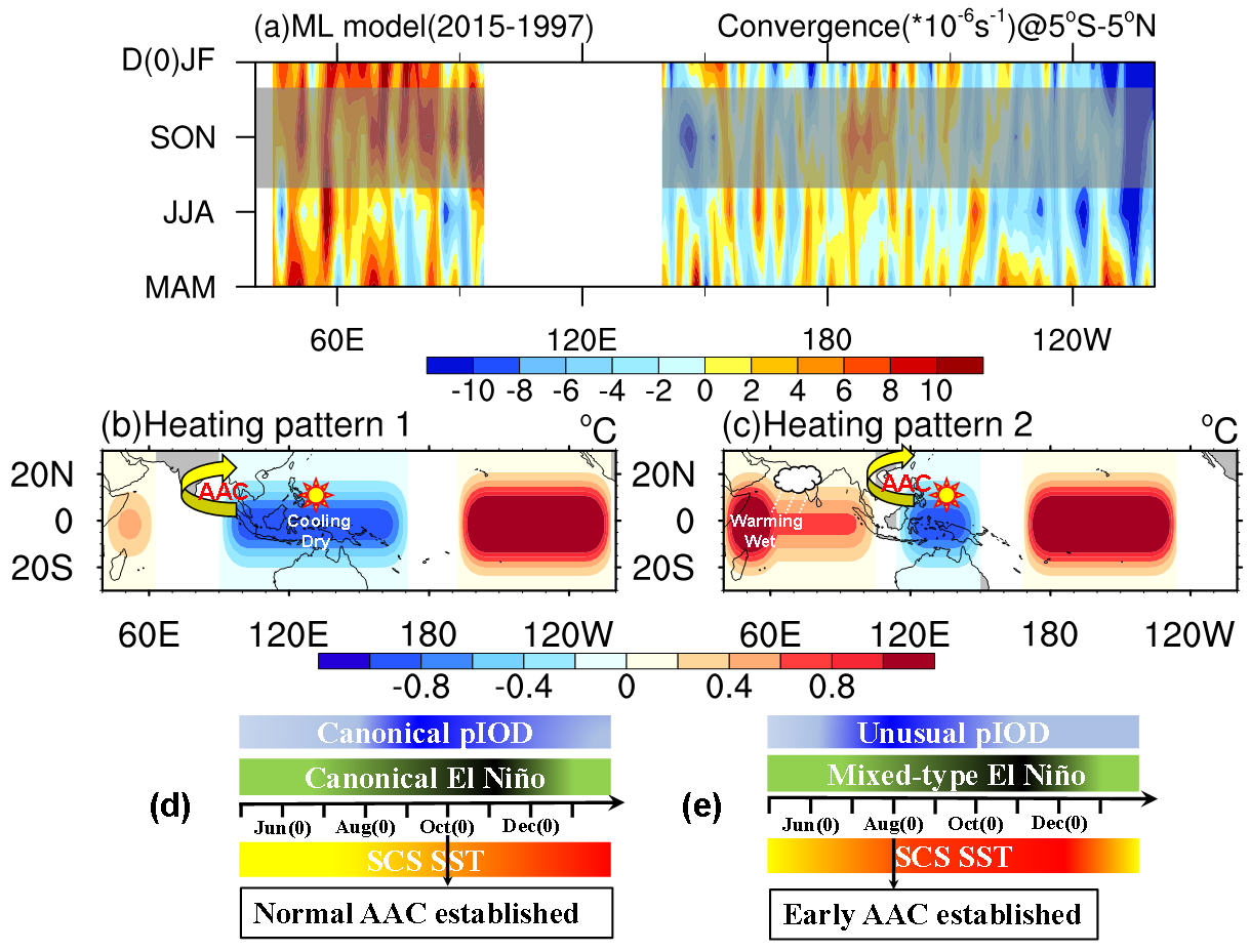 图1. (a)混合层模式模拟海温驱动的表层辐合随经度-时间分布的差异(2015减1997)。(b)与1997年8月与厄尔尼诺和正印度洋偶极子事件相关的海洋热源/冷源分布,及其用Gill模式强迫出来的异常反气旋的位置。(c)与(b)相同,但是为2015年8月的结果。(d) 1997年南海异常反气旋正常建立及其对南海海表温度影响的示意图。(e)与(d)相同,但是为异常反气旋提前建立及其导致南海秋季极端暖海温事件的示意图。