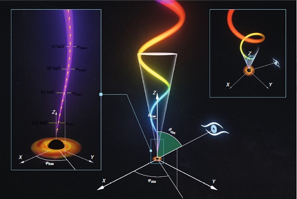 2018年3月11日,黑洞X射线双星(由一个几倍太阳质量的黑洞和一个恒星组成的双星系统)MAXI J1820+070发生爆发,在相当长一段时间里是天空中最亮的X射线源之一。慧眼卫星快速反应,对这一重要天体进行了长达几个月的高频次定点观测,积累了海量的观测数据。基于这些观测数据,研究团队发现MAXI J1820+070在很宽的能段范围内都存在低频QPO现象,最高能量超过200 keV,比慧眼卫星之前的QPO能量上限几乎提高了一个数量级,说明该QPO并不来自吸积盘的热辐射区域;进一步的研究还表明,QPO的频率和变化幅度都不随能量改变,且能量较低的QPO晚于能量较高的QPO产生,这些都和已有的流行模型严重冲突。因此研究团队提出,该低频QPO应该产生于黑洞视界附近喷流的进动,很可能是黑洞自转产生的广义相对论的参考系拖曳效应产生的。