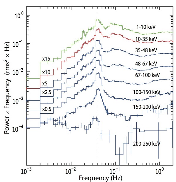 低频QPO发现于上世纪80年代,是一种在X射线双星中普遍存在的时变现象,表现为光变曲线上出现类似周期性但是并非精确周期性的调制。30多年来,低频QPO的起源一直是致密天体研究的一个未解难题。目前,存在两类最为流行的模型解释低频QPO现象,即物质在旋转落向黑洞的过程中形成的吸积盘上的不稳定性导致X射线辐射产生振荡,或者靠近黑洞的冕状X射线辐射区的进动或振荡导致X射线辐射产生准周期调制。但在慧眼卫星之前,X射线卫星只具有在30 keV以下的能区研究低频QPO的能力,很难区分这些模型。慧眼卫星的有效能段为1-250 keV,并且在30 keV以上具有最大的有效面积,科学家们期待慧眼在一些黑洞中探测到30 keV以上的低频QPO现象,从而对相关理论模型进行更加严格的检验。