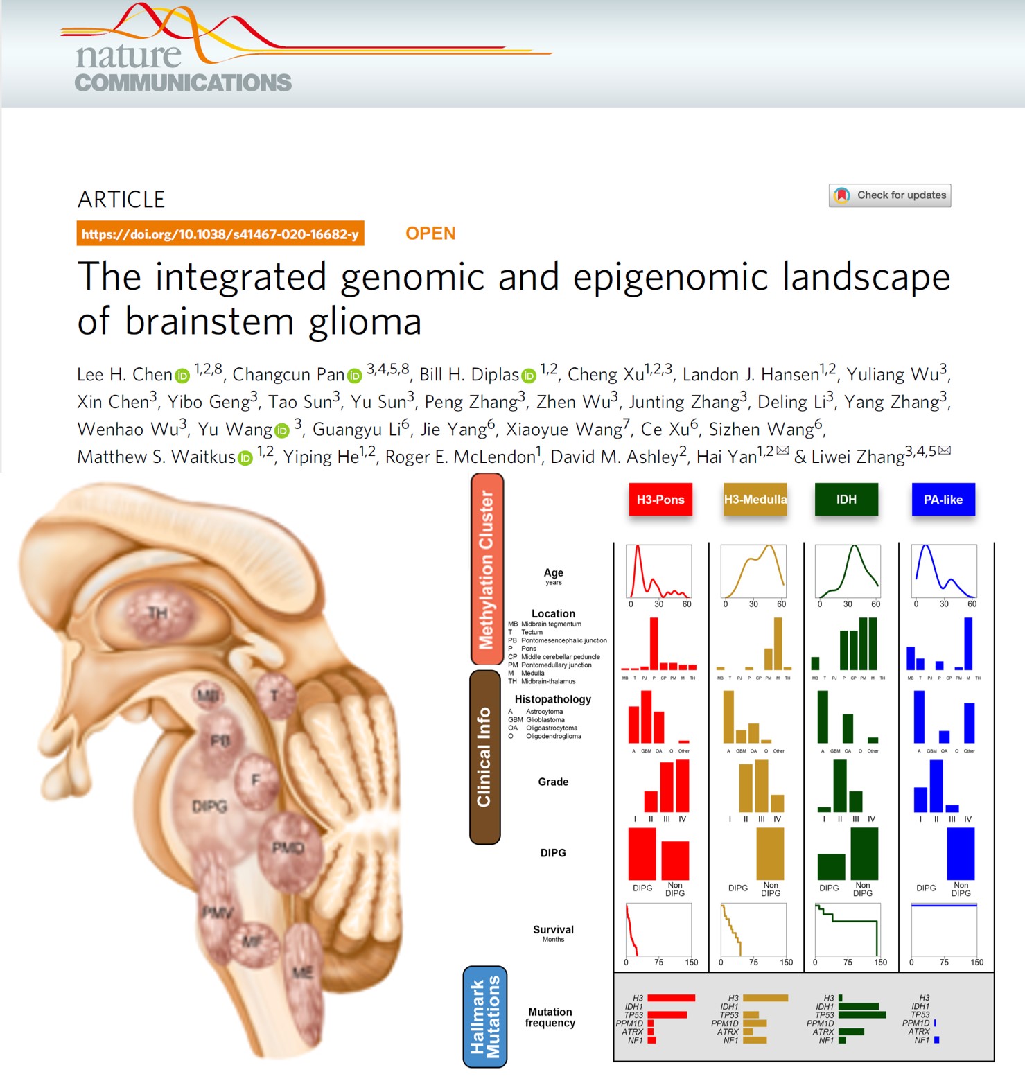 2020年6月,首都医科大学附属北京天坛医院张力伟教授团队在国际顶级杂志《Nature Communications》上发表题为“The integrated genomic and epigenomic landscape of brainstem glioma”的研究论文,从基因组学及表观遗传组学角度深度揭示了不同类型脑干胶质瘤的独特发病机制,为今后实现脑干胶质瘤精准诊疗提供了重要科学线索和理论支撑。杜克大学医学院博士生Lee H.Chen和附属北京天坛医院神经外科医师泮长存为共同第一作者,附属北京天坛医院、国家神经系统疾病临床医学研究中心、脑肿瘤研究北京市重点实验室张力伟教授和杜克大学医学中心阎海教授为共同通讯作者。