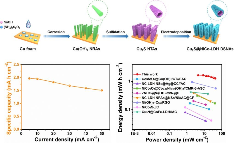 设计具有复杂多壳结构的分层空心异质结构的电极材料能够有效缩短离子传输途径,提高电子/离子电导率,提供大的比表面积以及丰富的氧化还原活性位点,从而有望获得优异的储能性能。胡勇课题组成员通过设计一个简单的多步骤策略制备了基于泡沫铜基底生长的Cu2S@NiCo-LDH分层双壳纳米管阵列电极。得益于独特的分层中空纳米阵列的结构优势和不同活性组分的精密组装,Cu2S@NiCo-LDH分层双壳纳米管阵列表现出优异的电化学性能,并在实际应用中展现出巨大的潜力。相关成果以“Hierarchical Cu2S@NiCo-LDH double-shelled nanotube arrays with enhanced electrochemical performance for hybrid supercapacitors”为题发表在J. Mater. Chem. A(中科院一区,IF=11.301)。研究生原泽和讲师王海燕为共同第一作者,胡勇教授和钟依均教授为共同通讯作者。