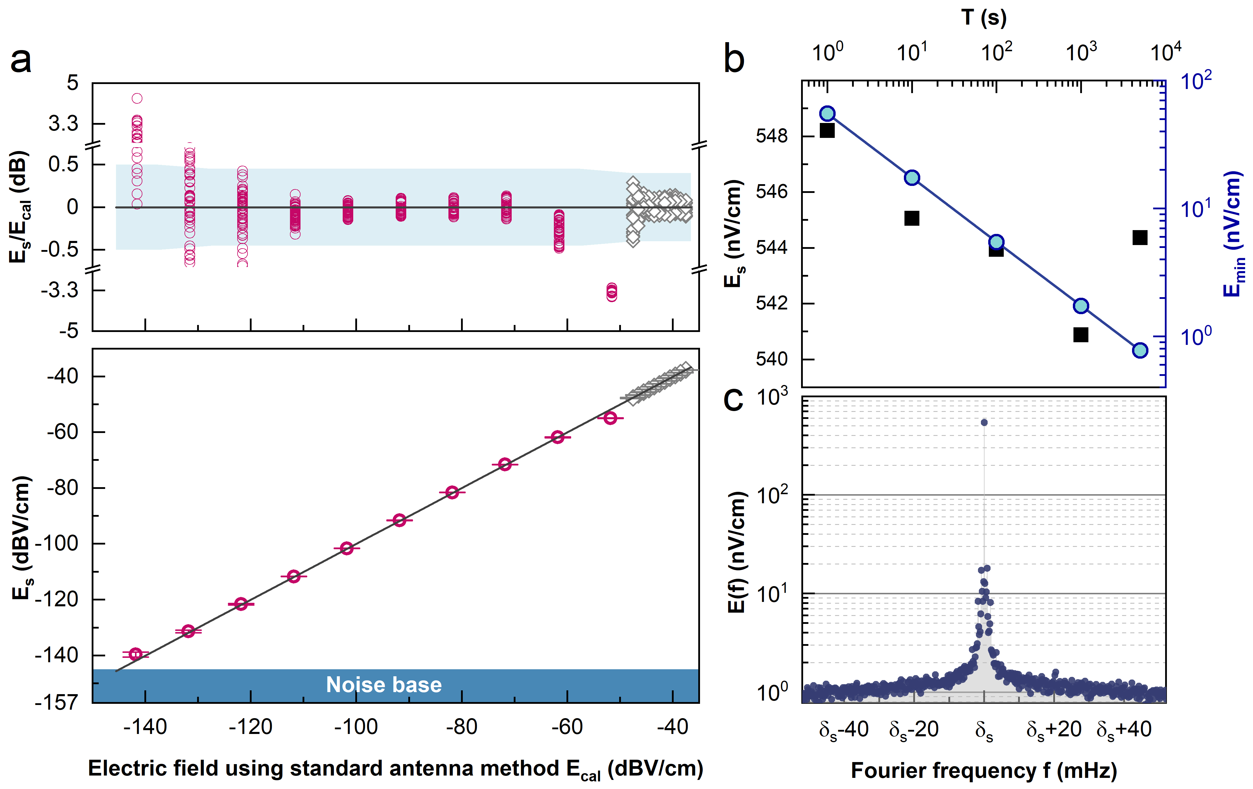 图2:原子超外差测量方法进行微波电场绝对值测量的实验结果。超高灵敏度的原子超外差测量方法实现了可溯源极微弱微波电场测量。