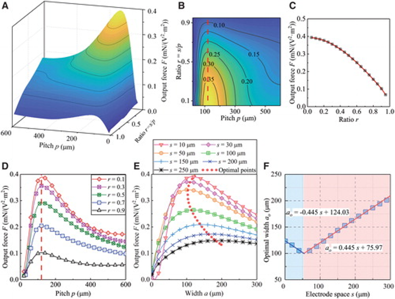图2:电极的宽度和间距对输出力的影响。