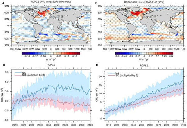 图1 低排放(RCP2.6)和高排放(RCP8.5)情景下CMIP5多模式模拟的海洋热吸收变化。CMIP5多模式平均的2006-2100海洋热吸收趋势(A, B),图A为RCP2.6情景,图B为RCP8.5情景,打点区域通过95%显著性检验,正值表示海洋获得热量。CMIP5模式模拟的北大西洋(35oN-70oN, 80oW-10oW,蓝色)和南大洋(35oS-70oS, 0o-360o,粉色)海表热吸收异常值2006-2100年平均序列(C, D),图C为RCP2.6情景,图D为RCP8.5情景,粗线表示多模式平均结果,彩色阴影表示一个标准差的模式间不确定性,计算异常值参考时段为2006-2025年,为方便作图南大洋热吸收时间序列的数值被扩大了三倍。(图片来自本篇所述科研论文)