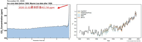 图 近一万年的大气CO2浓度曲线(左)以及全球平均温度曲线(右)。人类活动使得CO2浓度和全球温度在近一百年内迅速攀升,远超自然条件下的速率。无论是近一万年还是近几百年时间尺度上,人类活动过度排放到大气中的CO2都是全球变暖最重要的驱动力。(左图来自美国SCRIPPS海洋研究所, 链接https://sioweb.ucsd.edu/programs/keelingcurve/;右图摘自《WMO Statement on the State of the Global Climate in 2019》)