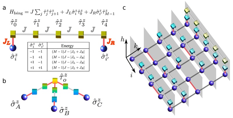 该研究的核心是将一个量子比特编码成一维的Ising耦合自旋链,N个量子比特就编码成了铺在一个平面上的N个一维自旋链【见下图】。而每两个量子比特之间的长程耦合可以通过引入一条一维Ising局域耦合的量子线来构建,系统中N平方个长程耦合对应的量子线可以按照特定的数学规则分配在不同的与编码平面垂直的法平面中,并保证不同的量子线不交叉。这样,作者把一个零维但全局耦合的模型通过升至三维的方式映射成了一个局域耦合的模型,转换成了实验中大规模可拓展的模型,就完成了对量子优化问题的“降维打击”。
