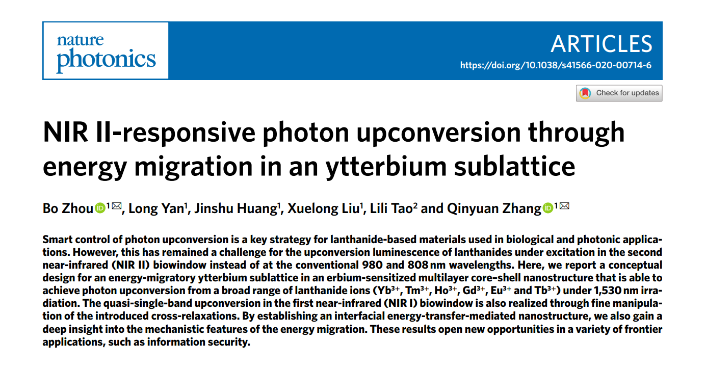 近日,华南理工大学材料科学与工程学院周博教授团队在Nature Photonics(《自然·光子学》)在线发表了题为“NIR II-responsive photon upconversion through energy migration in an ytterbium sublattice”(基于镱亚晶格能量迁移的红外II区响应上转换发光)的研究论文。该文章提出了一种可以有效实现红外II区响应的上转换发光机理模型,可望进一步推动稀土发光基础研究以及研发新型高效上转换发光材料体系。