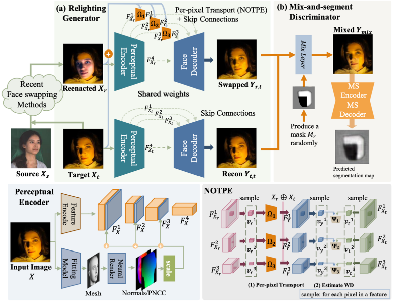 特征空间上的迁移:提出一种神经最优传输计划估计模块(NOTPE),通过最小化隐空间特征的Wasserstein距离近似求解最优传输,实现外观在隐层空间的映射。这样一方面规避了传统最优传输方法的大规模计算问题,另一方面解决了图像之间运用最优传输时生成不连续且不真实图片的问题。同时该方法提取人脸相应的坐标以及法线信息,用于表示面部几何和光照,使得在特征空间上迁移的过程更为准确。