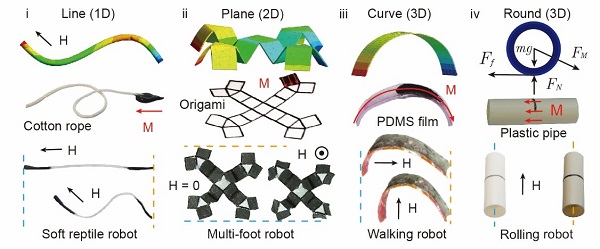 这种利用物体本身结构实现运动的方法具有极强的适应性。智能仿生中心尚万峰副研究员从理论分析和有限元模拟等多个角度入手,阐明了该类喷雾磁化方法的微型机器人通用运动学和动力学模型。理论分析显示,只要在磁力矩和磁拉力作用下不同的微型机器人会依靠其本身独有的结构和形态从而产生相应的变形以及步态。为进一步验证该策略的可行性,团队使用磁性喷雾将棉线、折纸、PDMS薄膜和塑料管等各种不同材料和形状的常见物体转化为磁驱机器人,并且在磁场驱动下实现了爬行、行走、滚动、游动等运动形式,与理论分析一致。除具备良好运动能力外,覆盖在物体表面的磁性喷雾还具有可控离解,可重编程等特点,为其在生物医学领域的应用提供了很大潜力,如主动送药、可控内窥探头等。