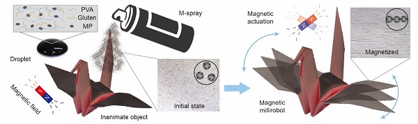 图1. 磁性喷雾将无生命物体转变为磁控微型机器人的过程