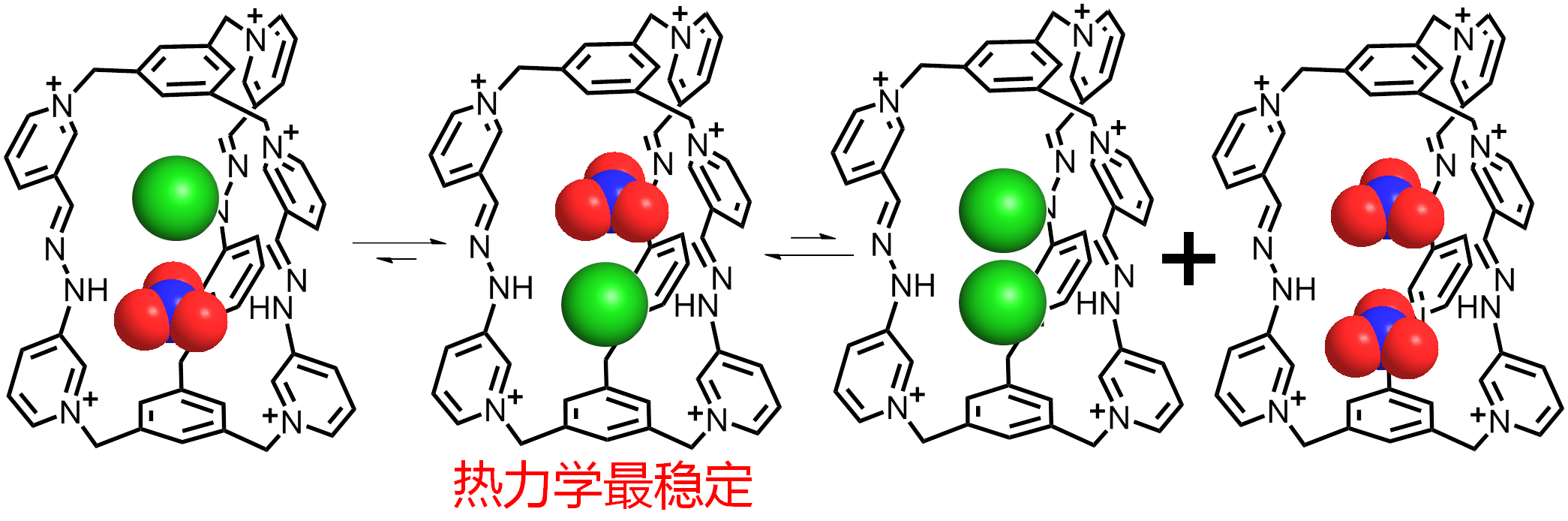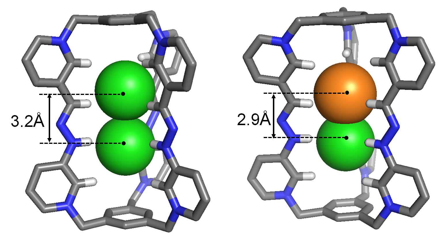 单晶衍射实验表明,笼状分子识别两个氯离子,或者一个氯和一个溴离子时,阴离子客体之间的距离皆小于它们的范德华半径之和,表明两个阴离子之间明显发生了诱导-偶极作用力。两个阴离子之间库仑力排斥带来的损失,由主客体之间的氢键和库伦吸引力补偿。这个工作再一次表明,通过主体分子的超分子包结能力,可以让许多原本热力学不稳定的产物加以稳定而创造出来。