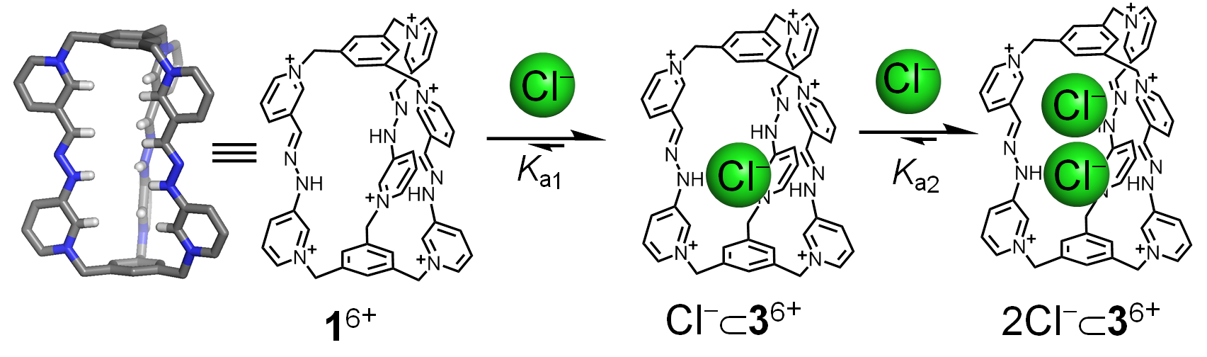 浙江大学李昊研究组一直致力于通过腙键的可逆性,高效的合成结构复杂的分子。笼状分子16+可以通过动态共价键在水溶液中高效合成。一方面,16+带有六个正电荷,能利用库伦吸引力识别阴离子;另一方面,笼状分子拥有12个相对酸性的质子,指向笼子内部,能和阴离子客体形成稳定的氢键。笼状分子16+具有阴离子识别能力。这些阴离子可以是氯,溴和硝酸根。