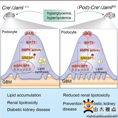 在该项研究中,易凡教授团队首先发现,JAML在糖尿病肾病小鼠肾小球中表达显著升高;体外模拟糖尿病肾病条件刺激肾小球固有细胞,足细胞中JAML的表达水平呈特异性升高;更值得注意的是,在糖尿病肾病及其他伴有蛋白尿的慢性肾病如局灶性节段性肾小球硬化和膜性肾病患者的肾活检样本中,JAML的表达水平显著升高,并与血肌酐和脂质沉积呈正相关,与肾小球滤过率呈负相关。进一步利用足细胞特异性JAML基因敲除小鼠制备了两种经典的糖尿病肾病小鼠模型。特别是成功制备了足细胞特异性JAML基因敲除db/db小鼠,发现足细胞特异性敲除JAML可明显改善糖尿病肾病的肾损伤,减轻足细胞内的脂质蓄积。在机制上揭示了JAML通过调控SIRT1介导的表观遗传学信号通路,作用于脂肪酸及胆固醇合成的转录因子SREBP1及其下游靶基因,从而调控足细胞的脂质代谢。该研究首次发现JAML在糖尿病肾病等多种蛋白尿性肾病中通过调控足细胞内脂质代谢,在足细胞损伤的发生发展过程中发挥重要作用。这一发现为糖尿病肾病等蛋白尿性肾病的防治提供了新的研究思路和作用靶点。