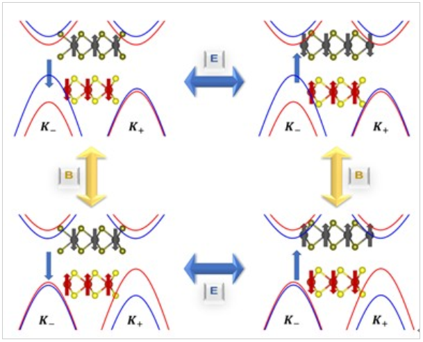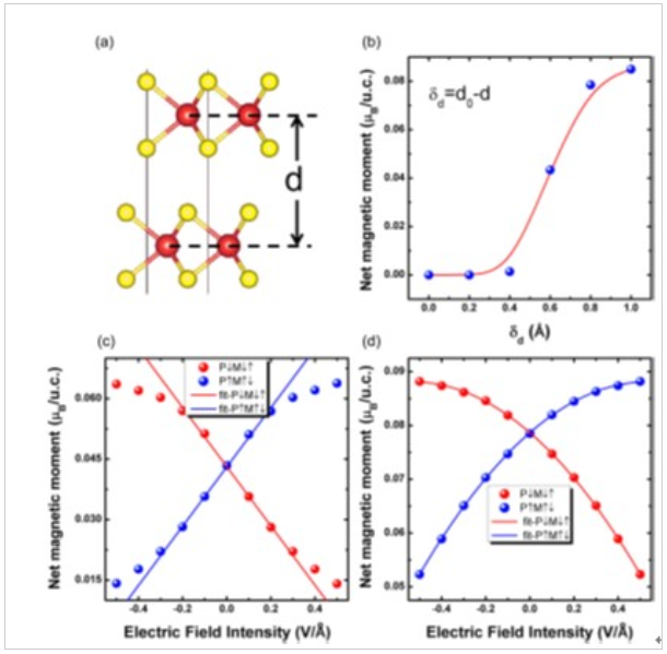 在澄清了滑移铁电机理的基础上,课题组探索了具有铁磁性和铁谷性的VS2,以及体系同时具有的铁电性,发现在双层VS2中铁电性和磁性可以通过铁谷性耦合在一起,实现电控磁性。同时,发现体系总的净磁矩与层间距有重要联系,在不同的层间距情况下,可以实现远高于已知材料的线性或二阶非线性磁电耦合效应。这种新的物理机制还可以推广到其他的二维铁电-反铁磁-铁谷体系中,对理解并操纵电子电荷、自旋、能谷自由度的相互作用具有深远意义。