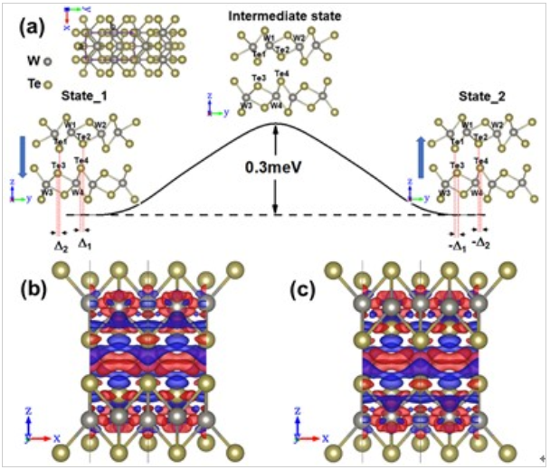 随着二维铁磁、铁电材料在实验室中制备出的样品被确认发现,国内外学术界迅速掀起了相关领域科学研究的热潮。铁磁、铁电性质对于丰富二维材料功能、开发基于二维材料的电子信息器件具有重要的意义。虽然有多个理论工作预言磁性和铁电性能够共存于二维材料中,但是二者相互独立、缺乏本征的磁电耦合。博士生刘新根在任伟教授的指导下研究了双层WTe2相对滑移导致的奇特铁电(Nanoscale, 2019, 11(40):18575-18581)。从微观上讲,铁电极化来源于层间未补偿的电荷转移,而且通过平面内的层间相对位移可以实现平面外的垂直方向极化矢量的双稳态反转。